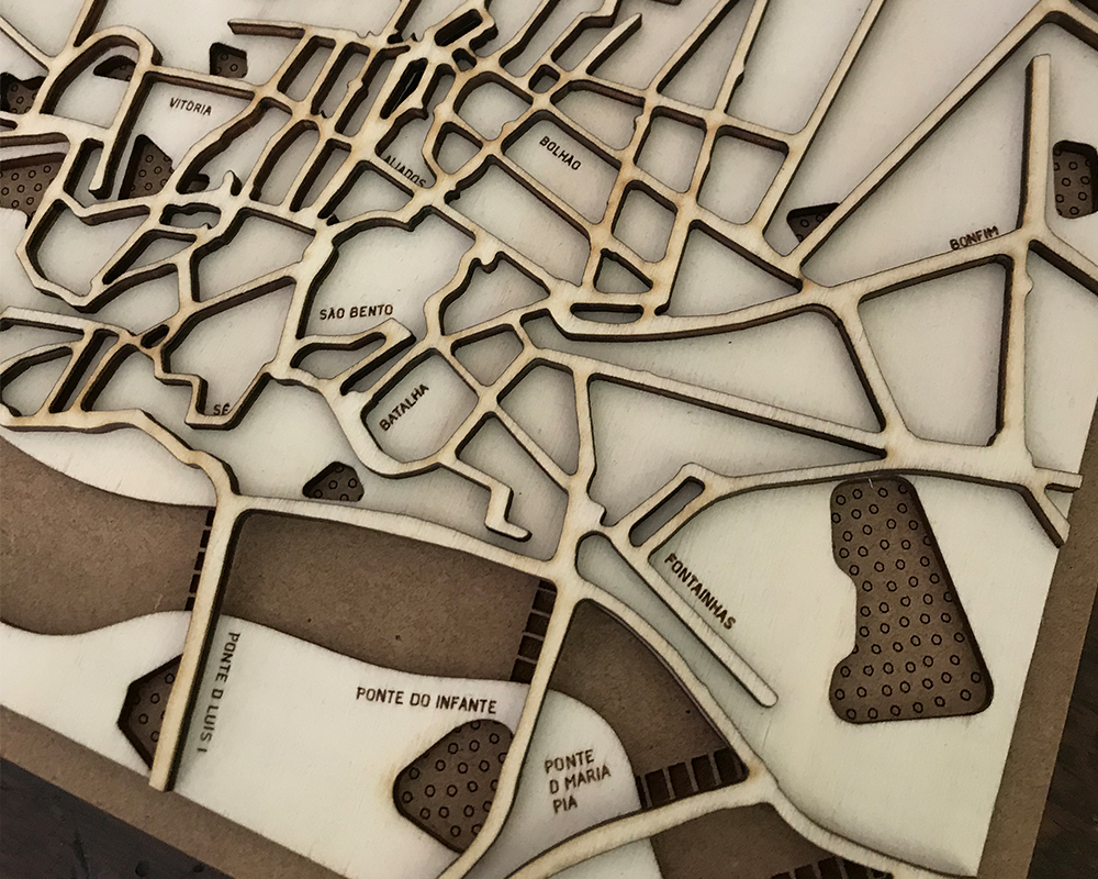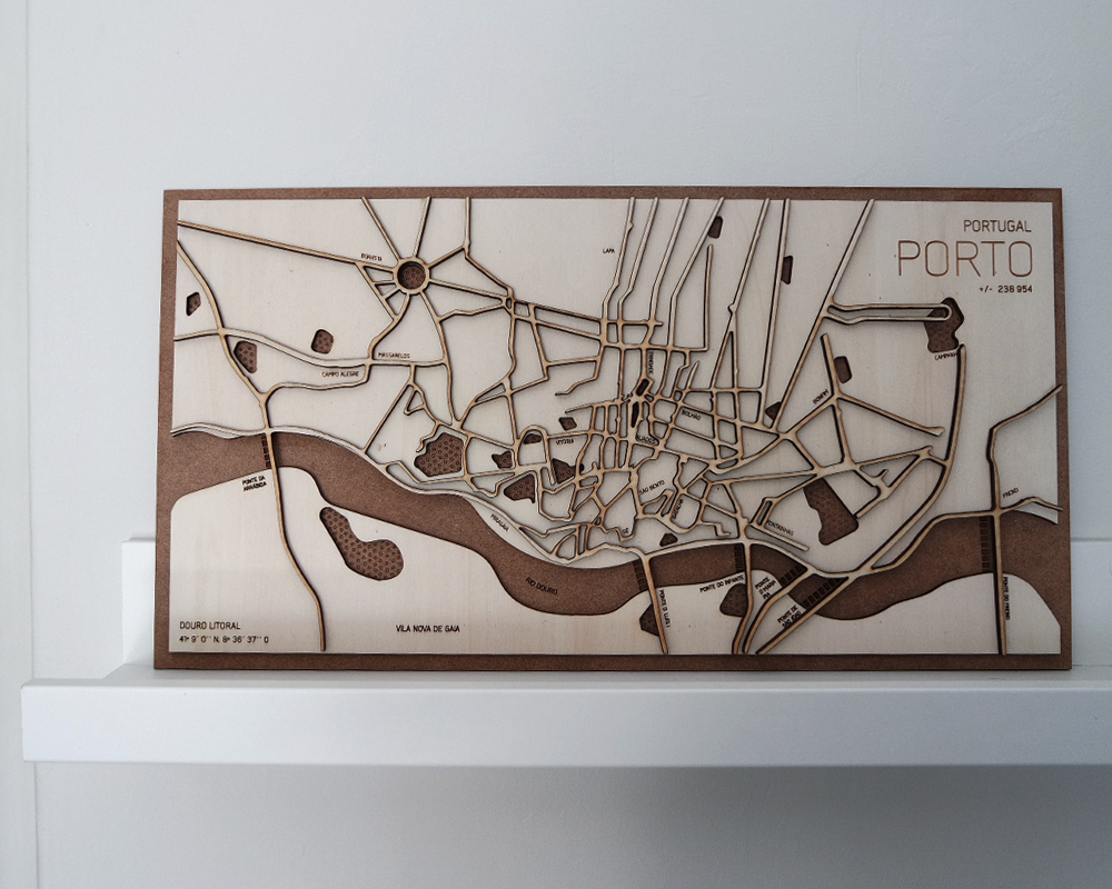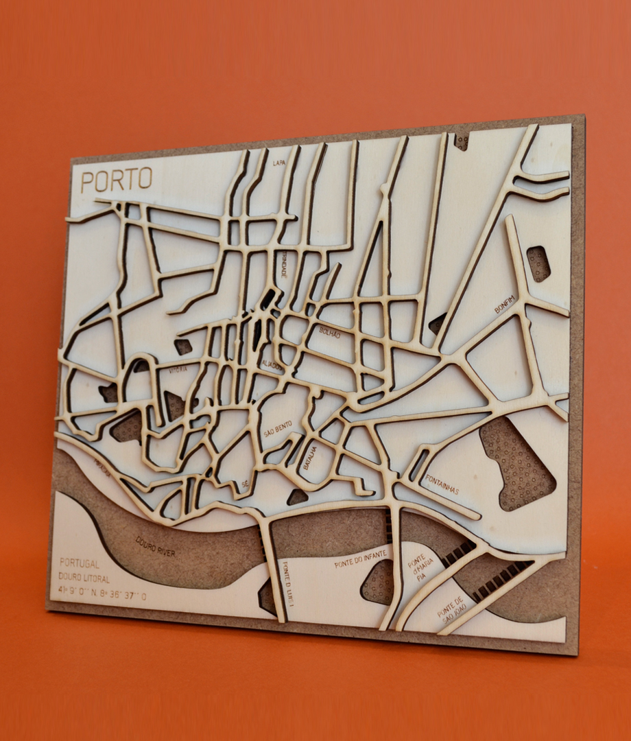 Os mapas de madeira, são de design minimal e com destaque para as principais ruas, espaços verdes e zonas de água, para melhor retratar a vista aérea da tua cidade.