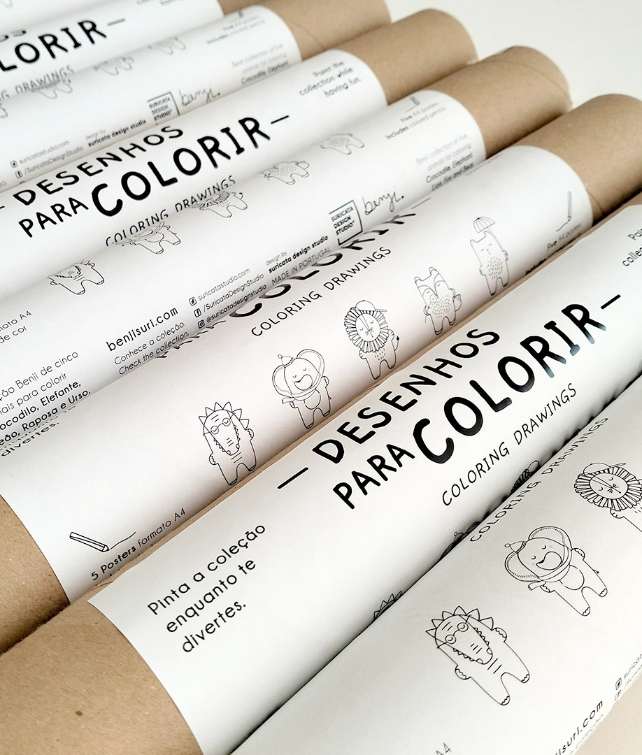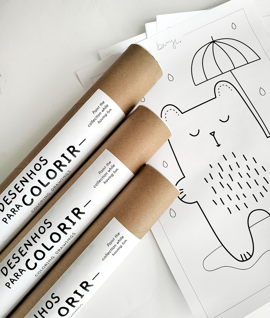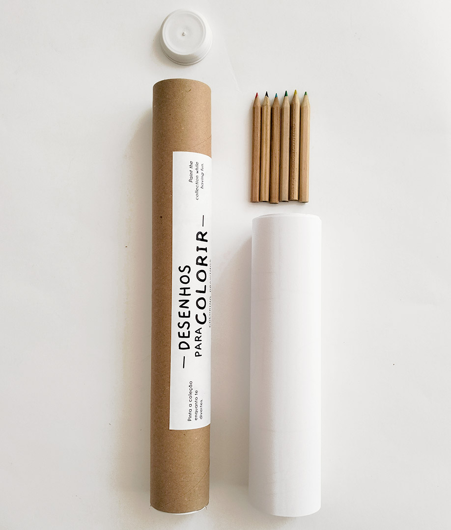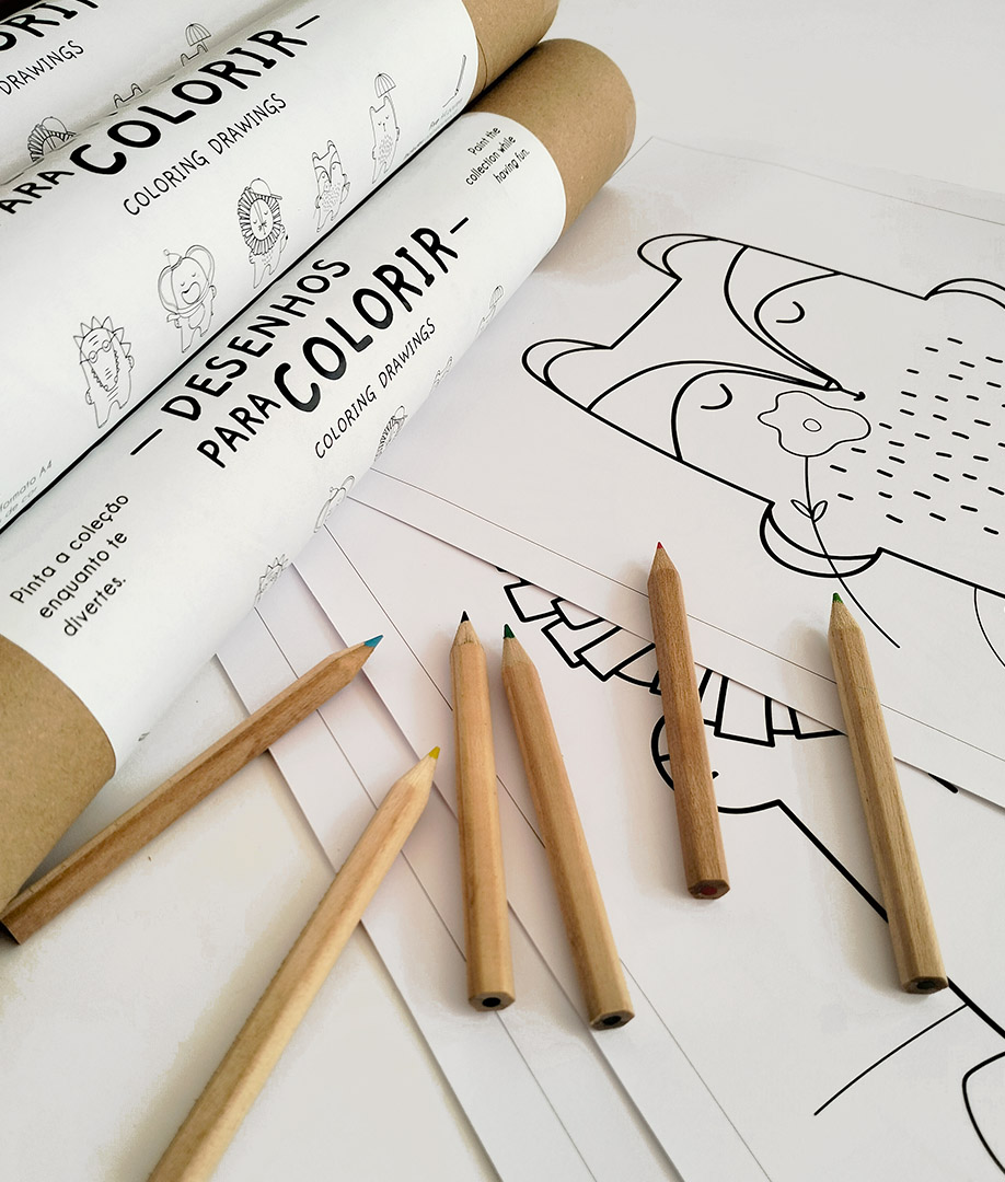 Neste tubo, encontramos 5 desenhos de formato A4 para colorir, observar, brincar e partilhar!